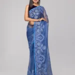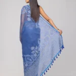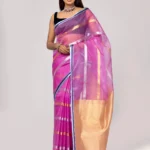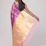 Purple Tangail muslin baluchari saree with weaving details. Unstitched blouse piece attached at the end of saree. Blouse shown in the photo is a styling suggestion, it is not a part of the actual product.